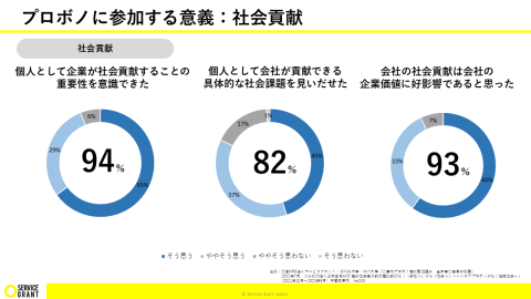 社員側へのアンケート結果では、皆さん社会貢献の重要性を認識したり、会社の社会貢献が企業価値観に良い影響を与えていると認識されたりしています。人材育成の観点では、本業ではない体験を通じて成長できる、生きがいややりがいに気づく機会になるという声もいただいており、企業の社員の皆様にとっても価値ある活動になっていると考えています。