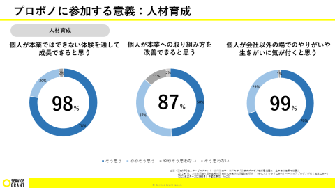 企業プロボノによる支援先団体の満足度は高く、98%がプロボノ支援を「良かった」と回答しています。