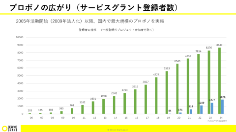 津田:この20年間、プロボノがどう広がってきたか。参考として、サービスブランドの登録者数は、現在約1万人に登録いただいており、ソーシャルや、プロボノという関わり方に非常に関心が高まっていることがわかります。