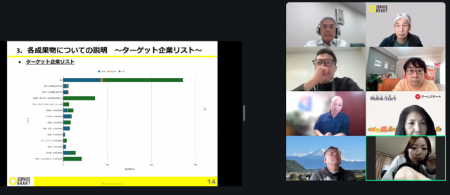 中間提案ミーティングを実施しました。これまでのチームで打合せをしてきた内容や、先に提出した成果物の確認、今後の進め方について話し合いました。先に納品したリストに基づいて団体側で営業をかけたところ、団体より数件の反応があったとの報告もありました。ゴールに向かって、さらに成果物のブラシュアップを進めていきます。