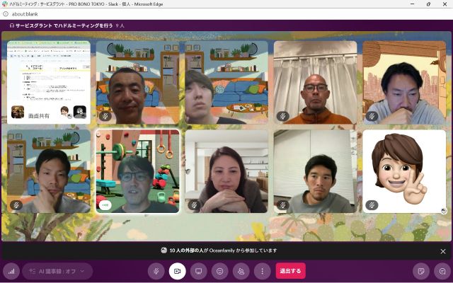 オンラインでメンバー7名と団体さんから堀代表をはじめ3名が参加し、キックオフミーティングを行いました。プロジェクトの方向性の確認と、今後の流れ、プロボノ側及び団体さんのタスクについて確認を行いました。
